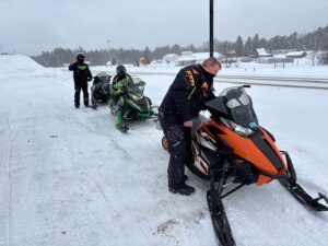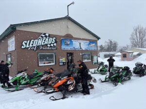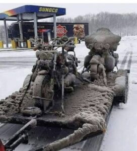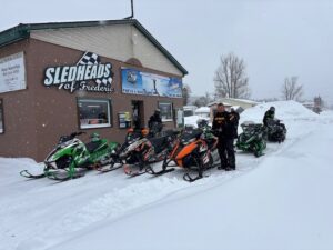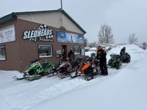 It was a nice, crunchy and sunny 14 degrees this morning when I woke up. I am now in Frederic at about 10;15 and its still sunny and up to 27 degrees. Saw many sleds yesterday and I think its safe to say that there are many sites about trails that things are very good for riding right now. Still nice and white every where and things look pretty good. I never heard from the guys that were going to the bridge yesterday to know if they got there or not. Several people wrote me and said they had some great rides and I should be out there myself. I think today is the last day for the Darkside Adventures ride. I havent checked for their update yet. Snow fell pretty much all day yesterday but it was just fluffy lake effect and only amounted to maybe and inch or so. The pics below are from yesterday. And the one is a reminder to make sure you have a slush guard on your trailer so you dont trash your sleds and make them freeze up and look like motorcycles. Thanks for checking in. Pete