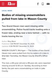 STAY OFF THE ICE & LAKES Once again 2 more sledders fell thru and drowned. That makes 4 this season, the first 2 were just walking on the ice and went thru and these next 2 were riding. Please be aware of where you are at. We had about 2 inches of new fluffy overnight again. Riders that were in yesterday were having a good time and the snow is holding pretty good. Lets see how this week goes. They are callilng for warmer temps later in the week. Thanks for checking in. Pete