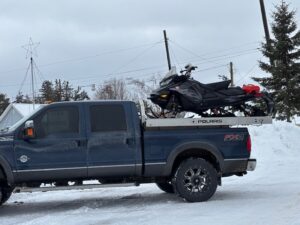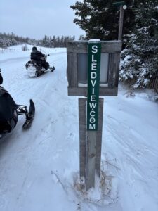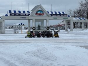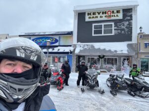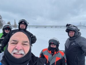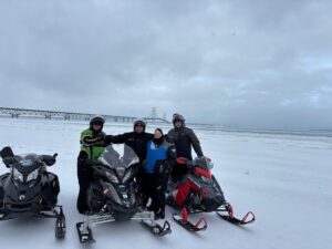 What a perfect day yesterday was the bridge run. 167 miles round trip, up thru Alanson and back thru Cheboygan. Stopped at the Sledview.com camera and then on to Alanson trail. Stopped at Spankys and had a nice talk with Josh who actually just bought the place yesterday. Stop in and say hi to him and his crew and tell them I sent you. From Alanson up towards Mackinaw, great snow and trails all the way, about 1 mile south of Mackinaw the groomer was coming down the trail and it stopped and the driver jumped out and flagged down Big John, Turns out he recognized John and had been riding with him before. He said it was their first time grooming this season. We went on to town for bridge pics and then over to the Keyhole for lunch only to find they were closed so we had lunch at the Dixie. Took us 4 hours to make it to the bridge. After lunch off to Cheboygan and Mullet Lake, with a warm up for hot chocolate at Breakers in Toppinabee. Continued at dark on to Gaylord for a stop at Lisa’s which was packed with sledders and who do we run into but the Obama Tour. After leaving there is when we hit the bad trail which was fine when we started out. Trail 7 from Gaylord to Frederic beat us up pretty good. Made it back to Sledheads at 8 for a great 11 hour ride. I heard trail 7 has been groomed now. I am so glad we did that run, the crew was Myself, Big John, Trent & Amber and Dustin who came with his new Polaris all the way from Iowa. At the beginningof the trip just before the sledview cam Amber got off to the side and got swallowed by a 5 foot ditch. It looked like good ground but she just sunk rightin front of me. Luckily the sled didnt roll on her and I had jumped off to help but I got ate up too. Other sledders stopped to help us out. I ended up rolling up hill to get where I could stand up. And on we went after that fiasco. We had a few inches of new lake effect overnight in Frederic and it seems pretty slow like a sunday out there. Still snow in the air and sled traffic has been light so far today. This is the most snow we have had in years. Happy New Year everyone and be safe out there. Frederic Inn has prime rib tonight in case you are hungry. Pete